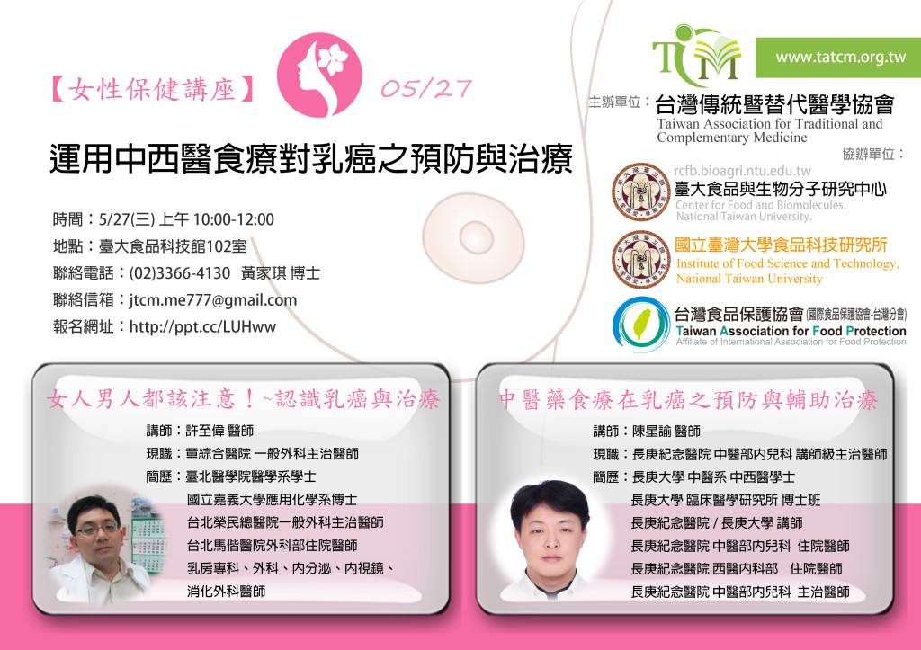 5/27女性保健講座–運用中西醫食療對乳癌之預防與治療-開始報名!!